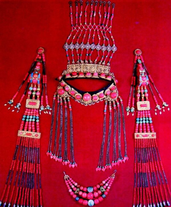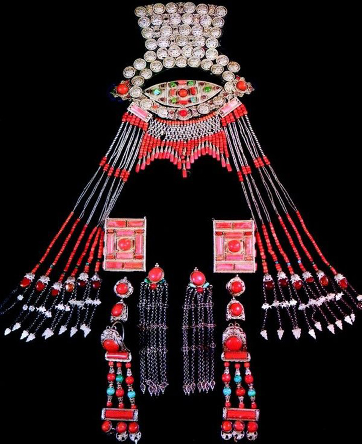 蒙古族頭飾很美麗、華貴,一般用瑪瑙銀鏈珊瑚玉石穿綴而成。蒙古族服飾反映了蒙古族悠久的傳統文化,至今仍然保持著旺盛的生命力。