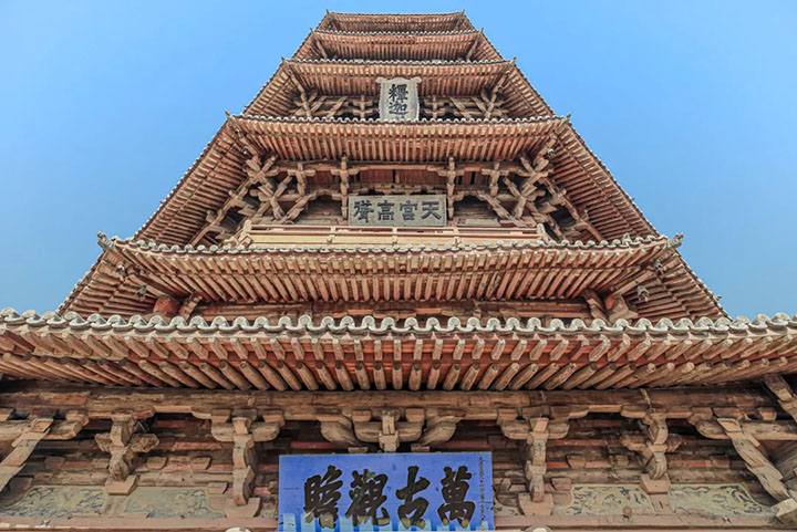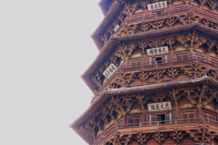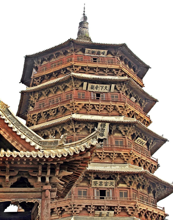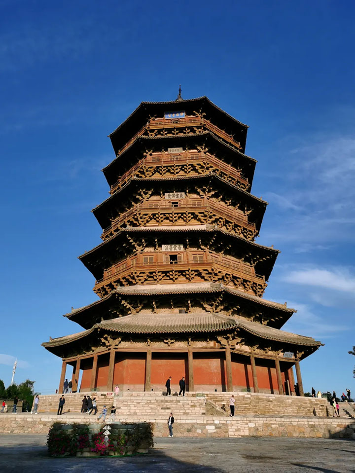 整座塔高六十多公尺,純木結構,無釘無鉚,經歷無數風雨雷擊、炮火地震,卻屹立千年不倒。