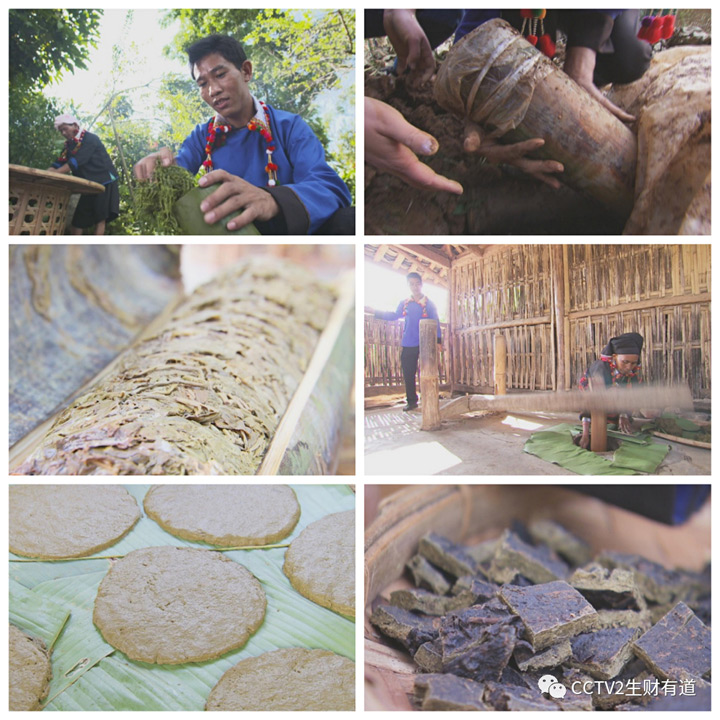 茶葉經過高溫殺青、揉拈後裝進竹筒、埋到地下、發酵取出、椿成茶泥、做成茶餅、剪成茶碎。