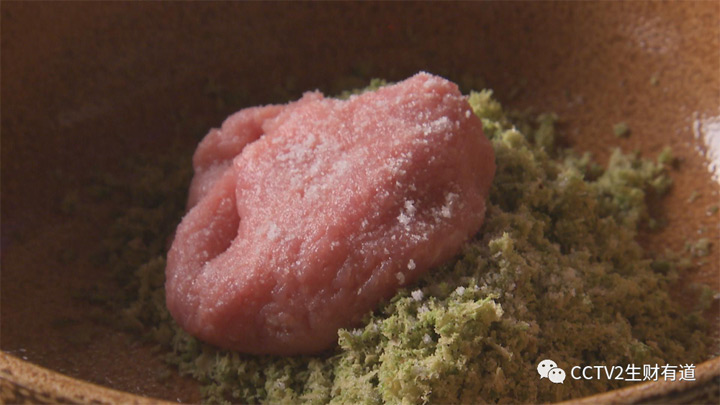 把橄欖樹皮內的綠層刮下,加水浸泡揉搓,去除澀味,擠幹水分後剁碎。 生猪肉剁成肉餡,放到處理好的橄欖樹皮上,加鹽攪拌。