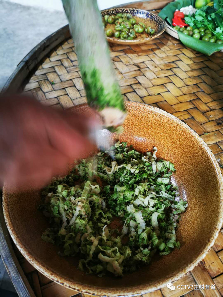 這個是德昂族的特色美食—橄欖撒。您能看出它是用什麽食材做成的嗎?