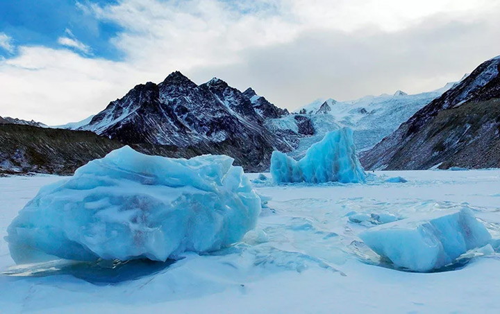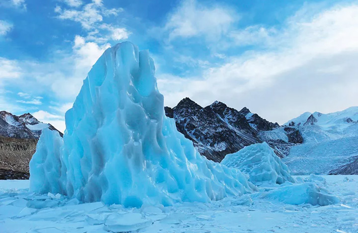 焫茸冰川表面,由一系列平行壟崗組成 , 頗似洗衣板上的棱脊,因來自冰川的垂直擠壓,形成冰皺褶和冰裂縫,呈現凹凸不平的形態。冰川底部是冰凍的冰磧湖,它大多出現在冰川的末端。湖泊上的冰山在光綫的作用下晶瑩剔透,如同巨大的藍色寶石。