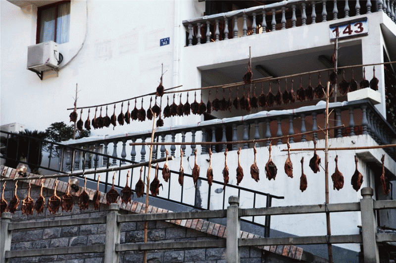 醬鴨出了醬油箱,肉色棗紅,芳香油潤,瀝乾後,挨個晾在支架上。接下來,就靜待時間和太陽的魔法,醞釀出記憶裡熟悉的味道。
