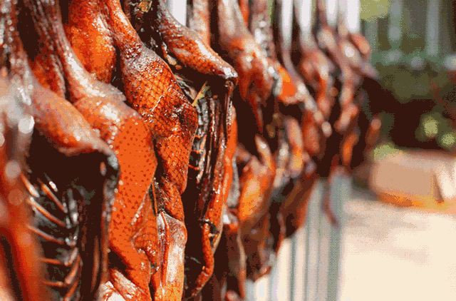 做著“擴胸運動”的鴨子一字排開,像是置身於健身房,頗為壯觀。經過半天的瀝乾後,鴨子就可以進入下一個步驟—醬製。
