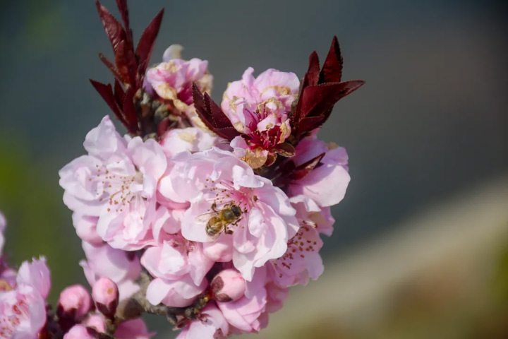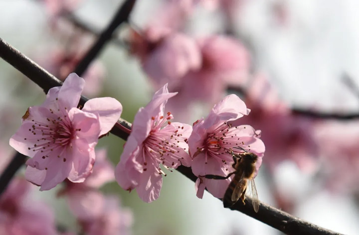 靜觀桃花,有幾隻蜜蜂飛了過來,繞著花朵翩翩起舞著,給這美麗的桃花又平添了幾分靈動的景色。
