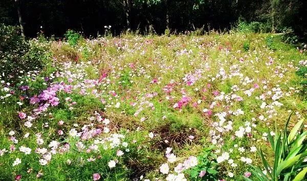 改造後重新開放的泉山森林公園,令人耳目一新,成為徐州人的天然氧吧。而密林深處的滑草場邊,有一大片波斯菊,紅的,粉的,白的……各種顏色的花兒競相綻放,令人賞心悅目。