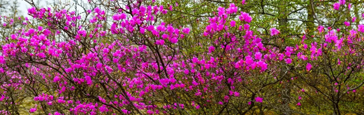 杜鵑花,別名達子香、映山紅,在朝鮮稱金達萊,杜鵑花科杜鵑種。每年五月份,成了杜鵑花的海洋。奼紫嫣紅的杜鵑花襯著尚未完全消融的白雪,在沉睡數百萬年的玄武岩上競相綻放,形成了令人嘆為的奇觀。