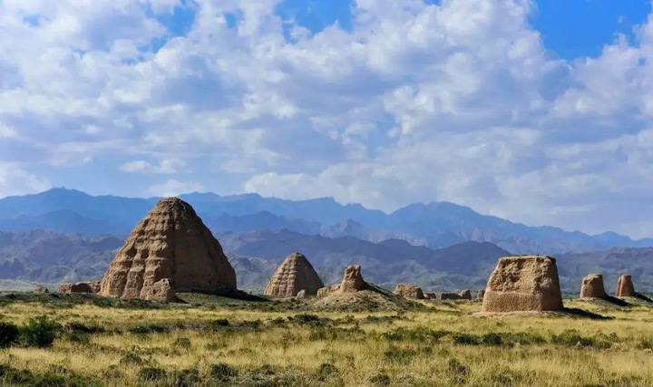 藍天白雲下,幾個高聳的土堆靜靜地屹立在千里大漠上,遠處的賀蘭山如駿馬奔騰,橫空出世。威嚴而肅穆,讓我遙想當年黨項人粗礦豪爽的神韻和颯爽英姿。
