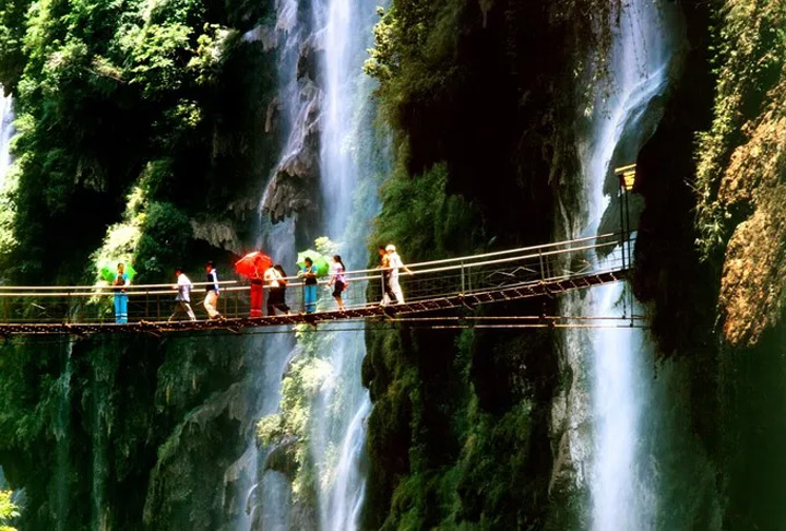 俯瞰這條造山運動而成的大裂谷,猶如大地敞開的一扇心門。它的地貌結構與一般峽谷不同,實際上是一條地縫。步入谷中,兩岸翠竹巨木、芳草千姿,素有“十里畫廊”美譽。與黃果樹瀑布一夫當關的氣勢不同,這裡群瀑齊飛,有如萬馬競奔,聲勢撼人。舉首仰視,眼前一線天溝橫亙,鼻尖如縷芝蘭盈香。頓時不知是在地上,還是地下,恍如當世遺境。