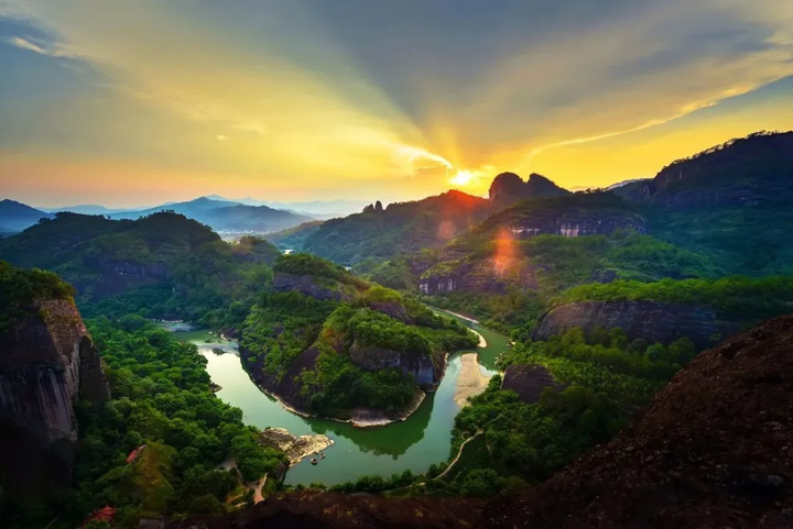 一曲到九曲,乘坐竹筏看武夷山最美的山水。“溪流九曲瀉雲液,山光倒浸清漣漪。”