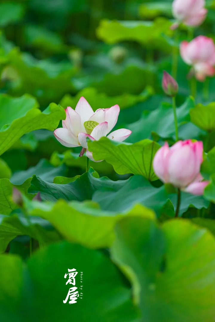 這一朵朵粉紅色的荷花,像一位位穿著粉紅衣裳的少女,頭上戴著黃色的蓮蓬,靜靜地站在那裡。一陣風兒吹來,這些少女們就翩翩起舞,看起來生機盎然。