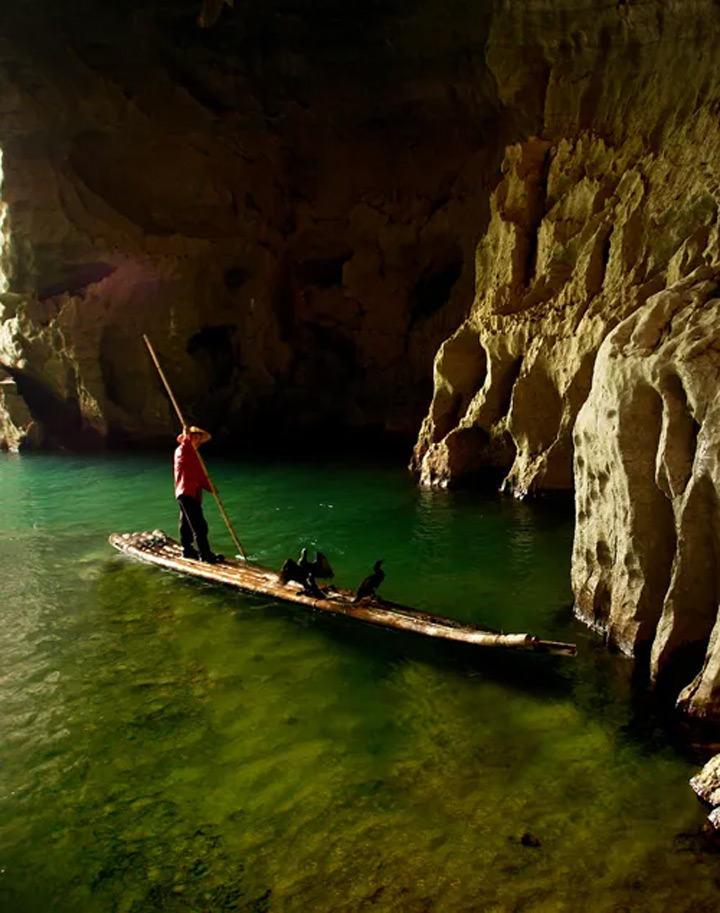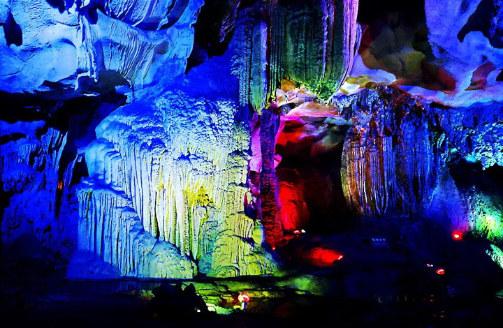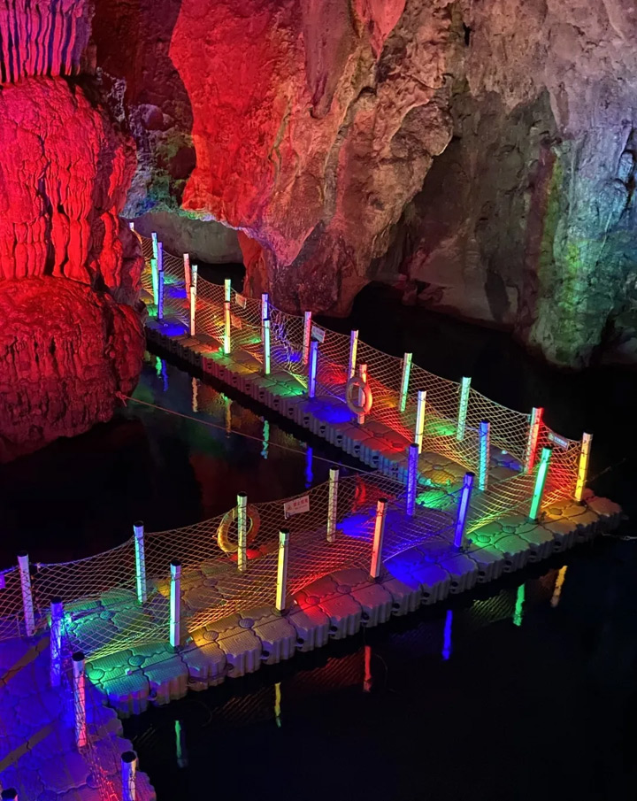 地下河七彩浮橋,猶如一條漂浮在地下河中的彩虹,如夢如幻。