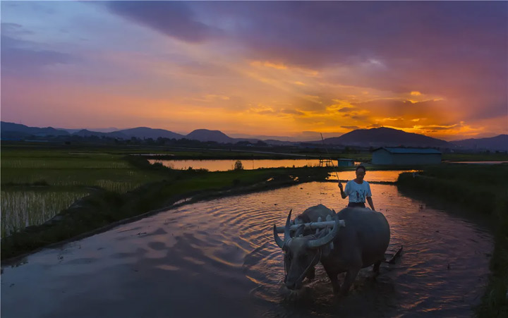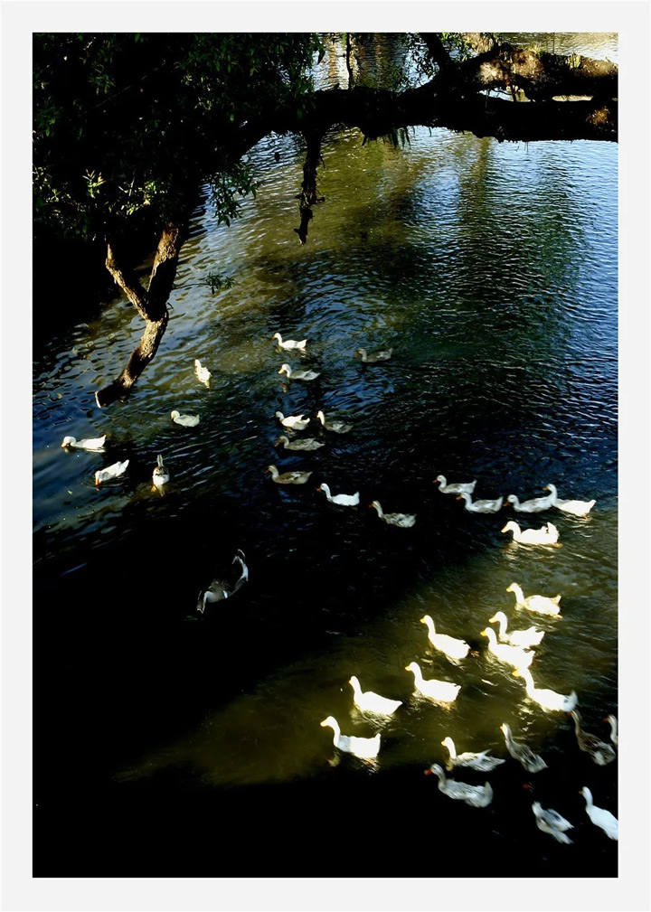 層層疊疊的梯田,彷彿流水從山間滑落,映照著河邊那一樹一樹的梨花。一彎小潭,是天空留給山坡的剪影,那一群慵懶的小鵝便浮在了白雲之上。