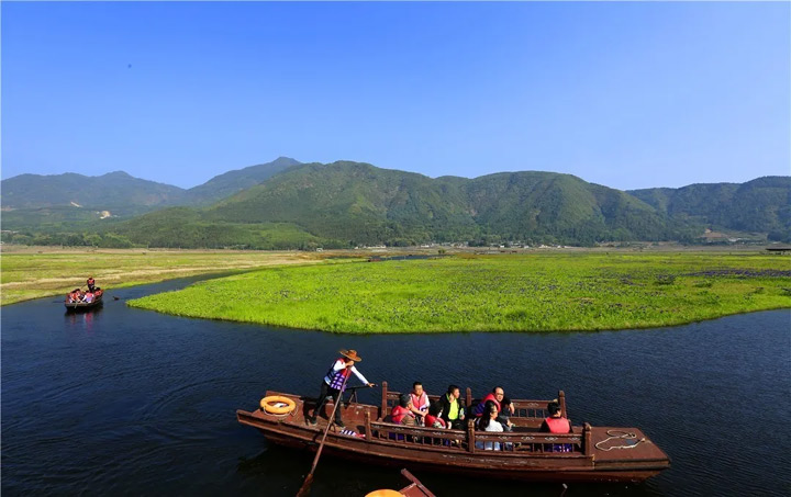 山水相生輝映,美不勝收。湖裡水草盤根錯節,生生不息。