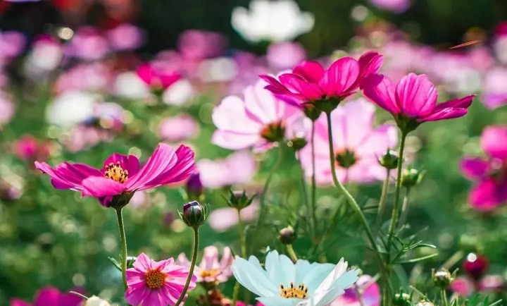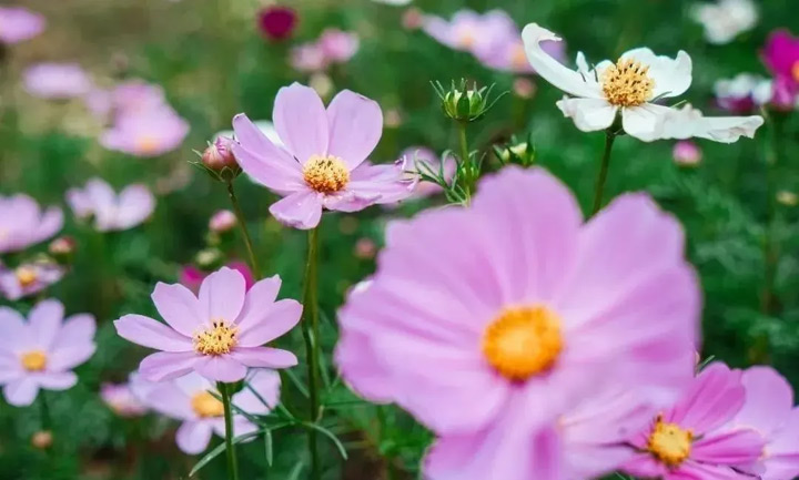 被月季、玫瑰、硫華菊、百日草、波斯菊等