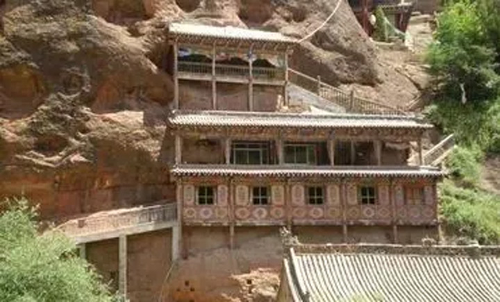 這裡群峰突起,山勢奇特,林木蒼翠,泉水淙淙,景色十分壯麗。寺院的東北面矗立著一座巍峨陡峭、像華山一般奇絕的南宗峰,她的北面有一條唯一能夠達到頂峰的石階山徑,大部分是從懸崖上開鑿而成的,山徑從懸崖上斜穿而過,有的地段幾乎是從懸崖上直上直下,猶如攀登雲梯一般險峻。從石徑登上頂峰,便可看到一座掩映在蒼松之中的古剎,這座古剎是由五所小石窟組成的,這些石窟有的自然形成,有的則為開鑿而成,窟門經過修茸,飛簷依山,雅緻幽美。登南宗峰遠眺,壯麗的坎布拉景色一覽無遺。