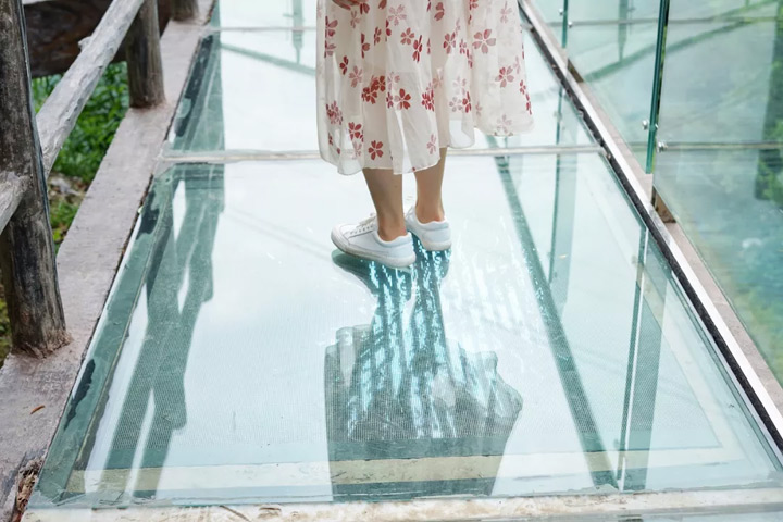 棧道上特效重重,耳旁冒出一陣陣玻璃斷裂的聲音,腳下伴隨著玻璃碎了的裂紋。如果感到害怕,就靠裡側慢慢走吧~