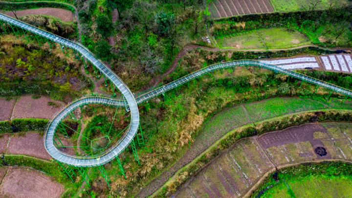 走到半山腰的時候,就迎來了重頭戲:玻璃滑道。滑道建在梯田之上,底面和兩側由玻璃搭建組成。環形而下,不斷有水瀉下,如同一條透明長龍。
