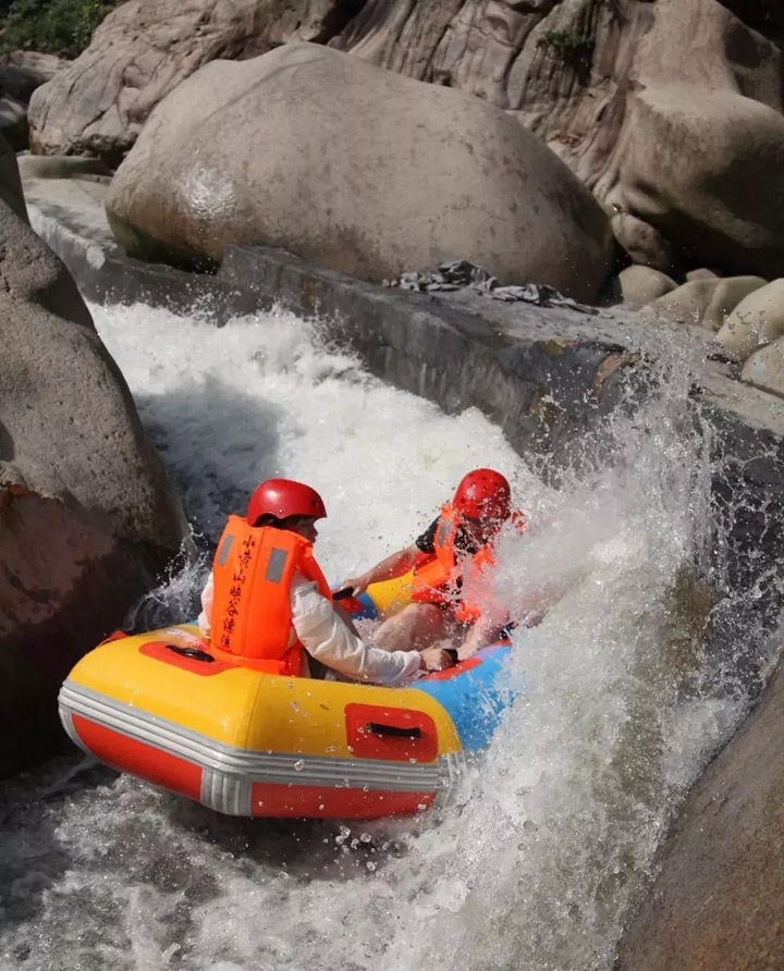 皮划艇一次坐兩個人,讓重力平衡,下滑更穩當。中間的幾個大彎道,快速轉向的感覺真的太爽了。為了照顧更多朋友,滑道的設計不會過分驚險,重在體驗的愉悅性。
