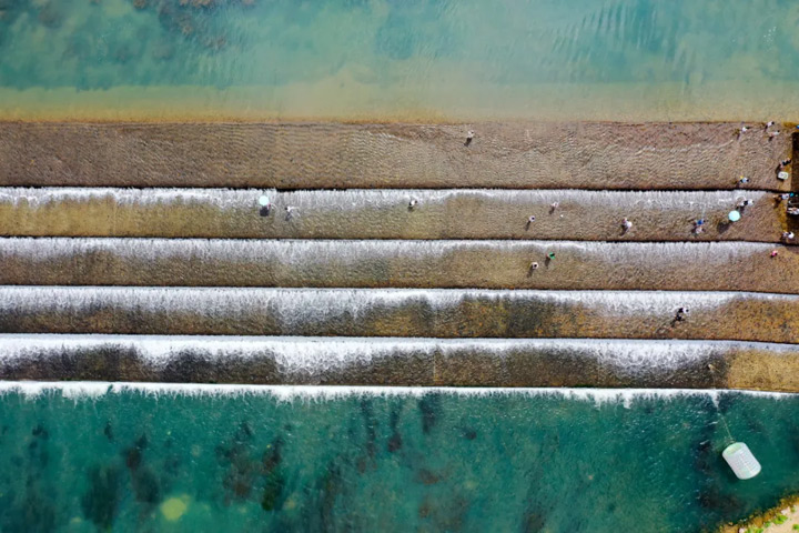 黛山墨水,天高雲闊。成蔭綠樹,光影斑駁。水流過大壩傾瀉出銀色的光芒。水梯田上的人們三倆成隊,手把手說笑著,緩步慢行。一不小心便惹得身後一片清涼。