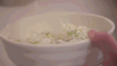 一只只飽滿的薄皮餛飩浮在碗中,還冒著熱氣。碗內配有蝦米、紫菜、粉絲、雞絲、韭菜和榨菜,十分誘人。