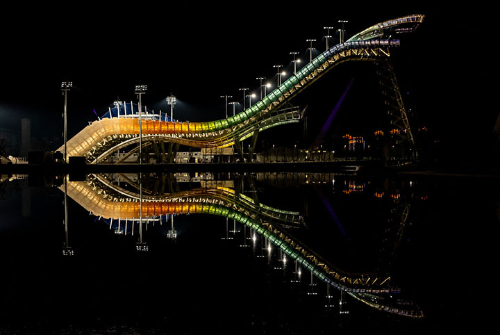 張家口賽區的國家跳臺滑雪中心(即“雪如意”)是首座符合國際標準的跳臺滑雪場地,將承擔跳臺滑雪和北歐兩項項目比賽。其設計靈感來自傳統飾物“如意”。張強/《視覺中國》