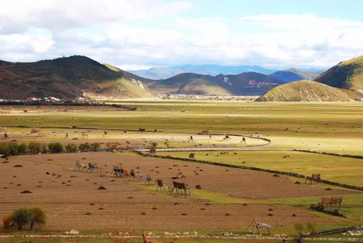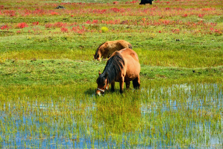 納帕海自然保護區有著香格里拉最大的草原,入秋後草甸變了色,還有成群的牛羊在悠然自在地吃著漸漸泛黃的草。