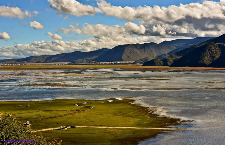 在高原,秋天總會來得早一些,秋風乍起,納帕海已是滿地金黃,遠山、草原、牛羊,這是屬於大西南的塞北風光。