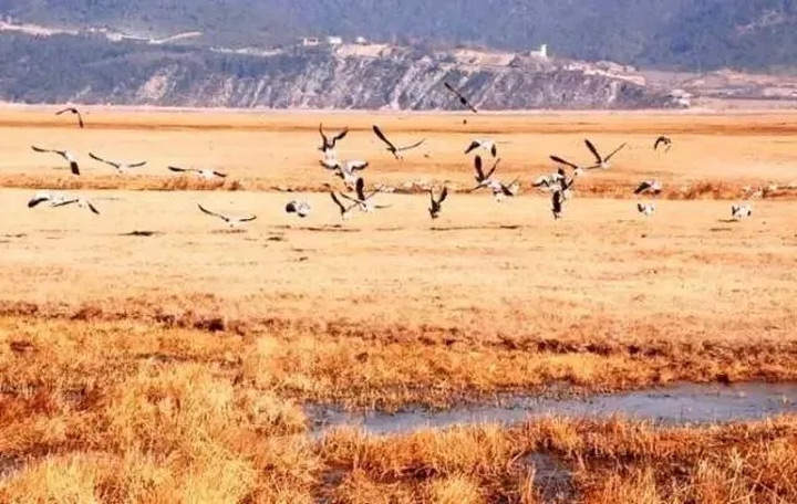 再過些日子,秋意更濃時,會有候鳥從遠方遷徙而來,到時候就會有黑頸鶴、黃鴨、班頭雁在草叢中嬉戲打鬧,時而躍然飛起劃過水面,去留無意、雁過無痕。