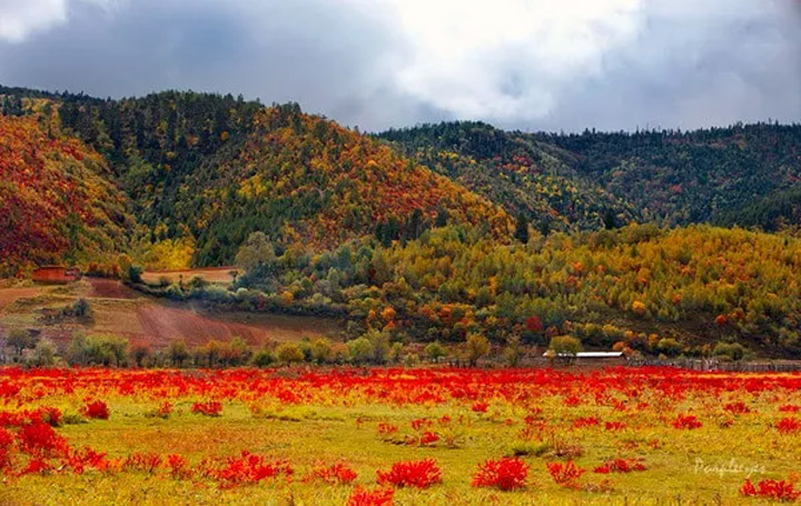 每年的9月至11月,香格里拉小中甸的原野就會被大片大片的狼毒花染得火紅,異常絢麗。