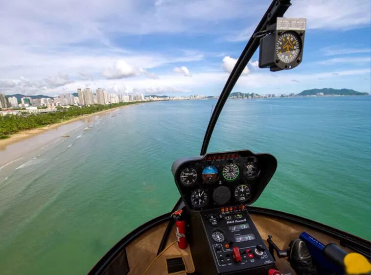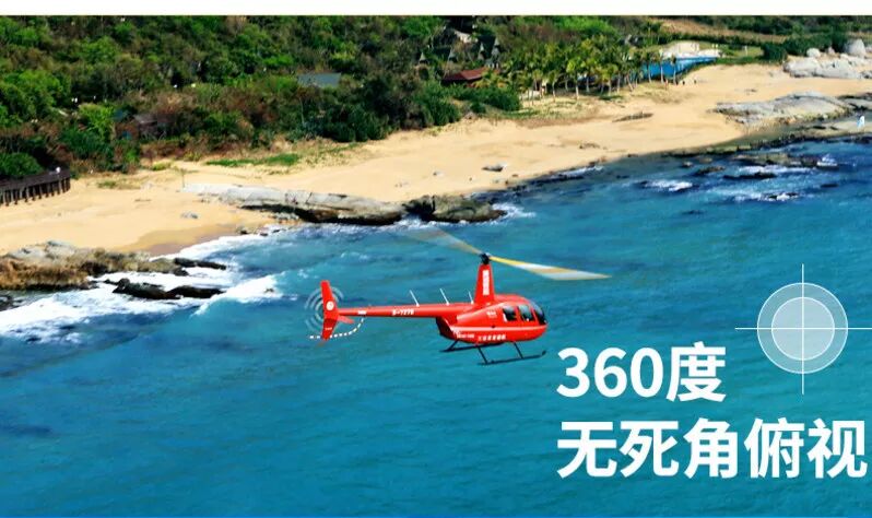 戴好防噪耳機、系上安全帶,在轟鳴聲中,直升機緩緩升起,旋即飛向三亞灣上空。