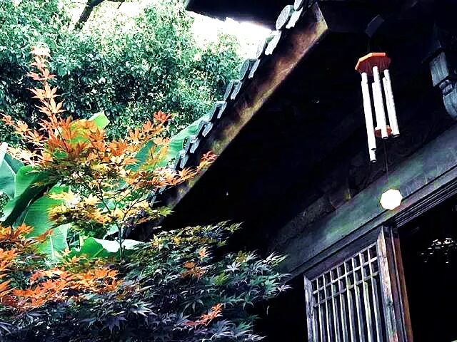 白色牆,黑色瓦,紅色的歡喜茶館四字在一篇靜寂中最是亮眼,進去的小石路邊花草樹木小竹林,從小竹筒裡流水入石壇,清脆的水聲伴隨著悠揚的琴聲,彷彿置身於世外。