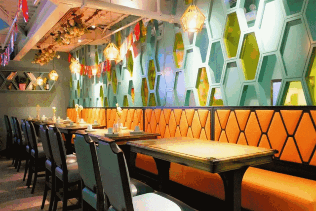 店舖內的整體裝修十分文藝清新,薄荷綠的蜂巢牆面,明黃色的卡座皮椅,再搭配幾何形吊燈,粉白紫藍相見的花球從屋頂垂落,煞是好看。
