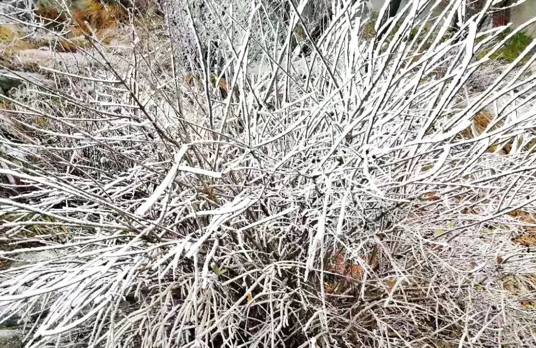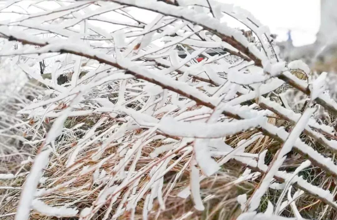 路邊樹木的枝椏被霧凇包裹的毛茸茸的,