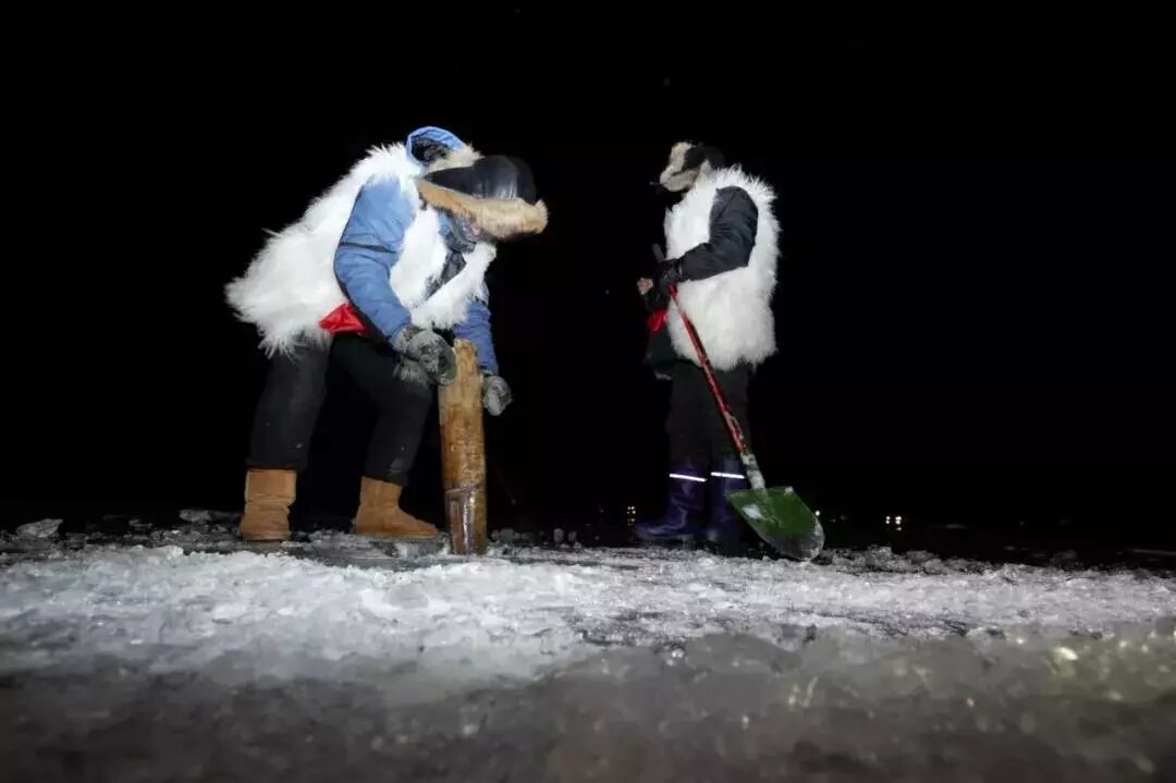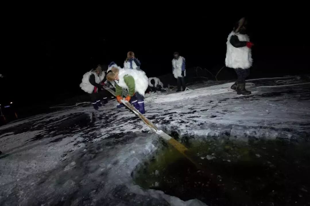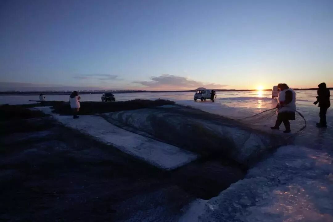 五大連池冬捕的採用最原始的捕撈方式,人工佈網。那張巨大條形漁網,光沿著冰眼在冰下撒開,就得好幾個小時。
