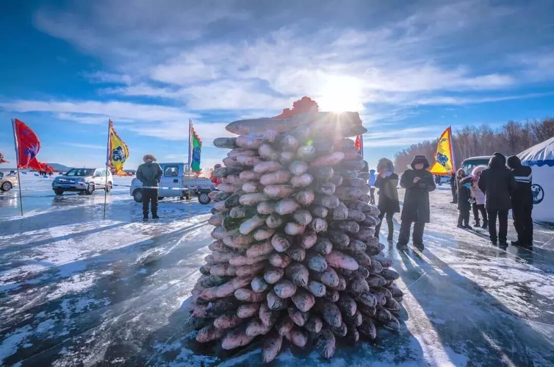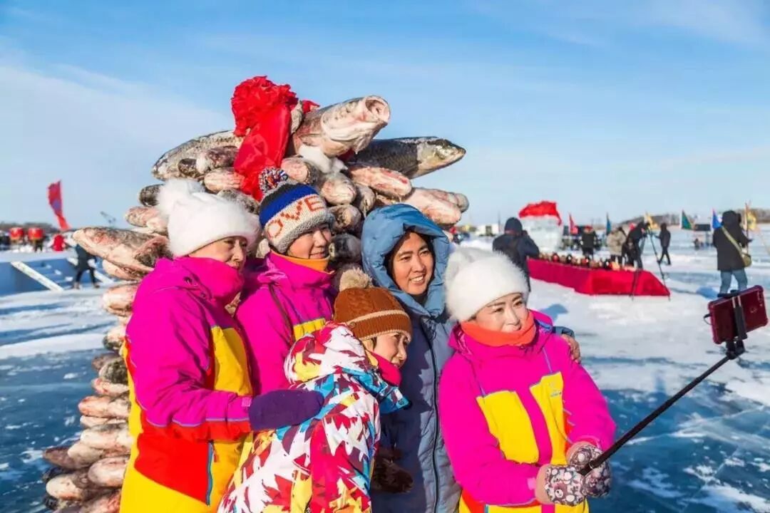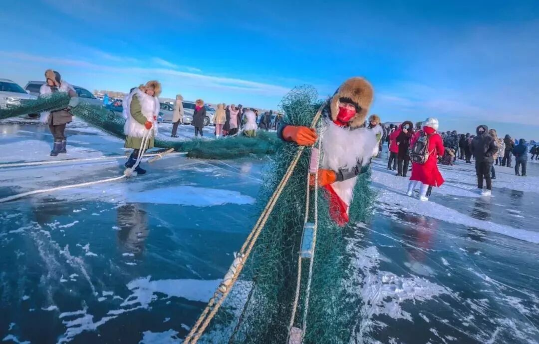 漁民們將網中活魚撒在冰面之上,作為新年的好彩頭,遊客競相挑選心儀的大魚,將“連年有餘”帶回家。