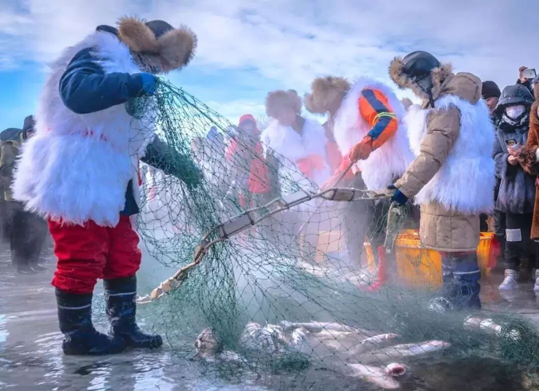 祭祀儀式後,“魚把頭”與上百名漁民們身著東北皮毛大衣緊抓漁網,齊聲高喊起網號子,慢慢將漁網拉出冰面。“出魚了!”伴隨三聲高亢嘹亮的號子響徹湖面,漁民們奮力向一端將網拉出冰面,一條條身肥體壯的礦泉魚在水汽蒸騰中跳躍而出。