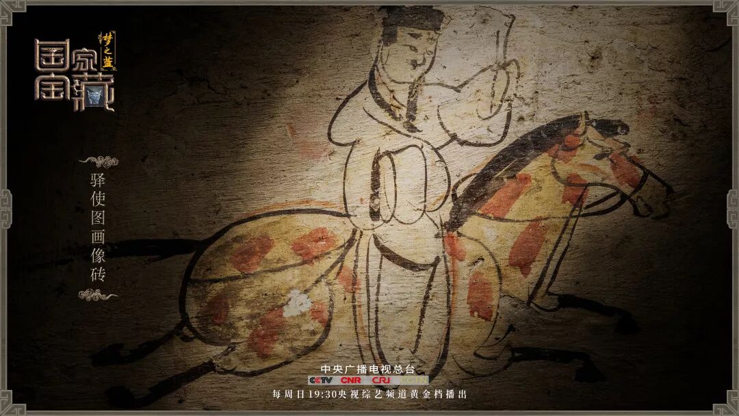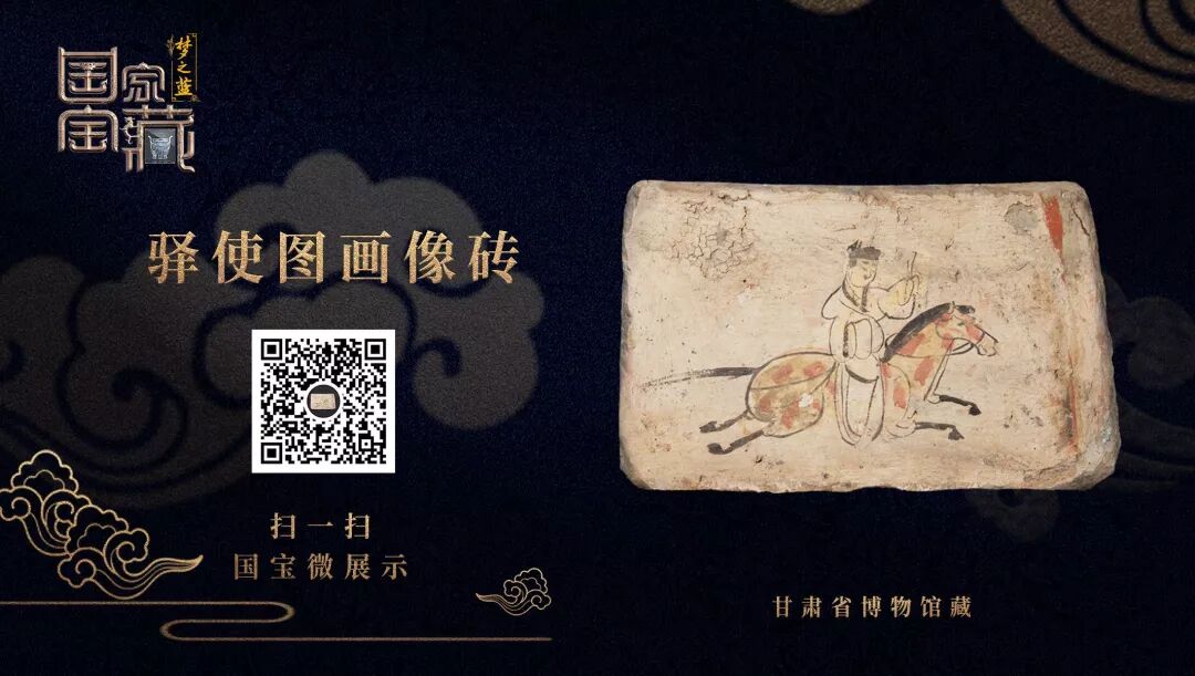這件驛使圖畫像磚於1972年出土自嘉峪關新城堡魏晉墓群。它長34厘米,寬17厘米,米黃色的磚石上,寥寥數筆,就傳神地刻畫出1600多年前西北邊疆的郵驛情形。一名驛使頭戴黑幘,身穿右襟寬袖衣,神情肅穆,穩坐馬背。他一手緊控韁繩,一手舉示棨傳文書,磚上特意沒有畫出他的嘴,據說是為了表明昔日驛傳的守口如瓶。