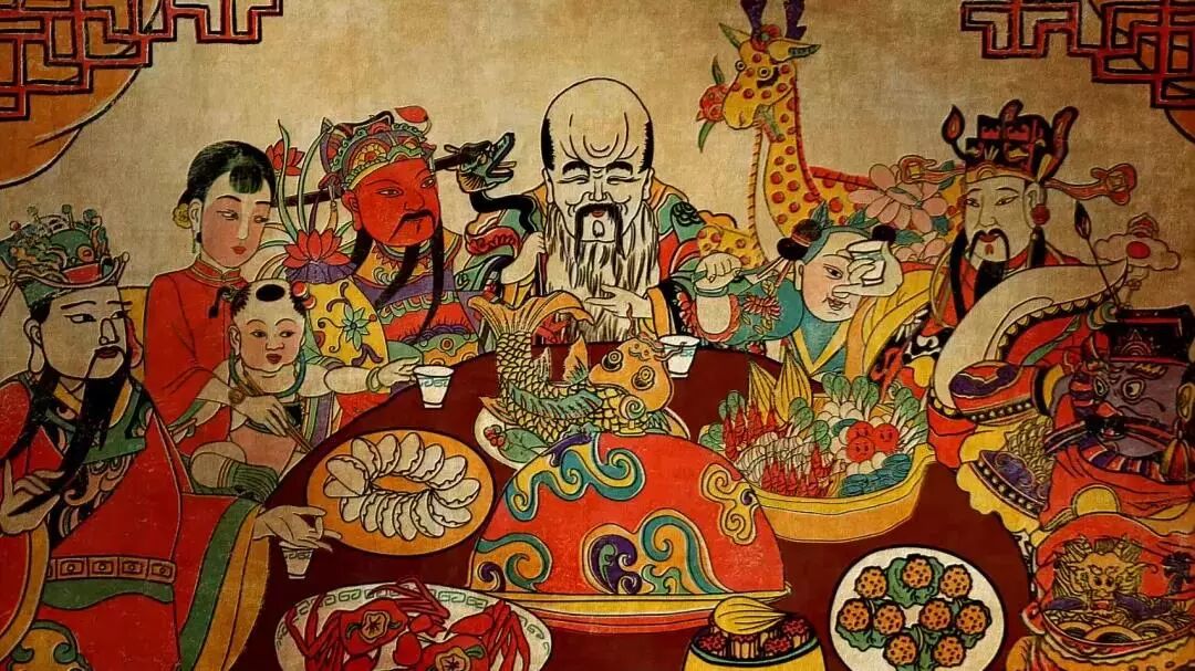 端著盤子的灶君,為全家人準備了一大桌豐盛的年夜飯—— 文官、財神、灶君、鍾馗、仕女、童子齊坐桌前,老壽星端坐中間,這是什麼神仙年夜飯哦~