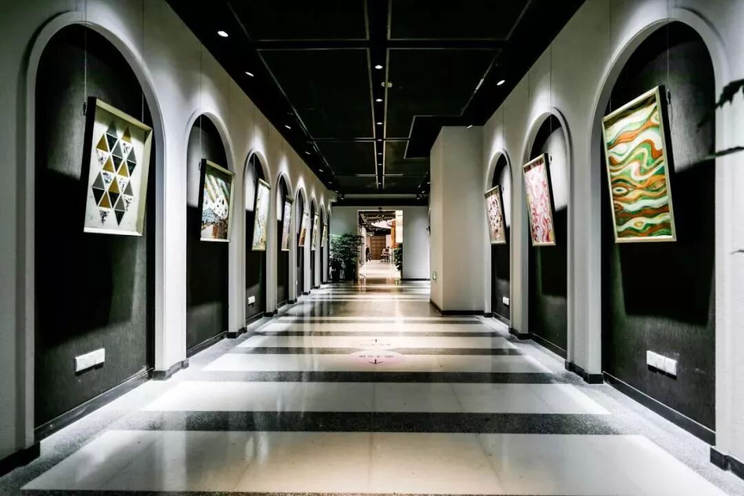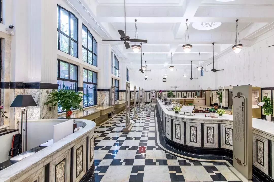 一層大廳是一個淨高6m的大跨空間,大廳中吊燈、風扇均為歷史原物。黑白拼花大理石護壁和櫃檯,透出冷靜典雅的氣質,牆面、天花的裝飾線腳突出線條感,配合抽象幾何的圖形,透著濃濃的藝術感。