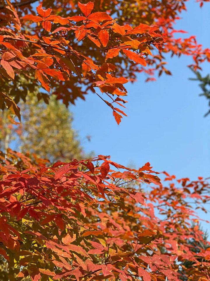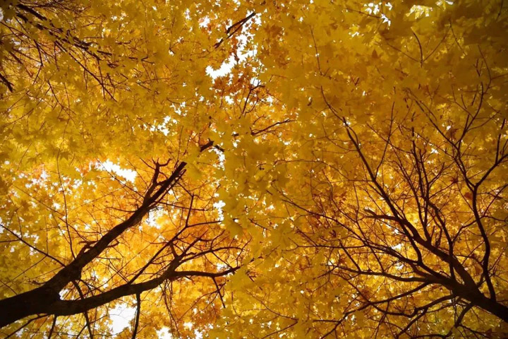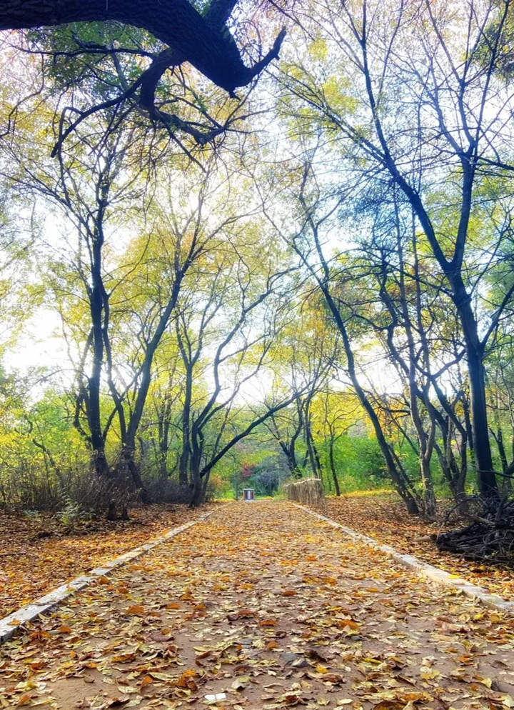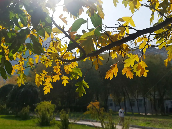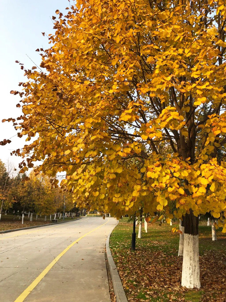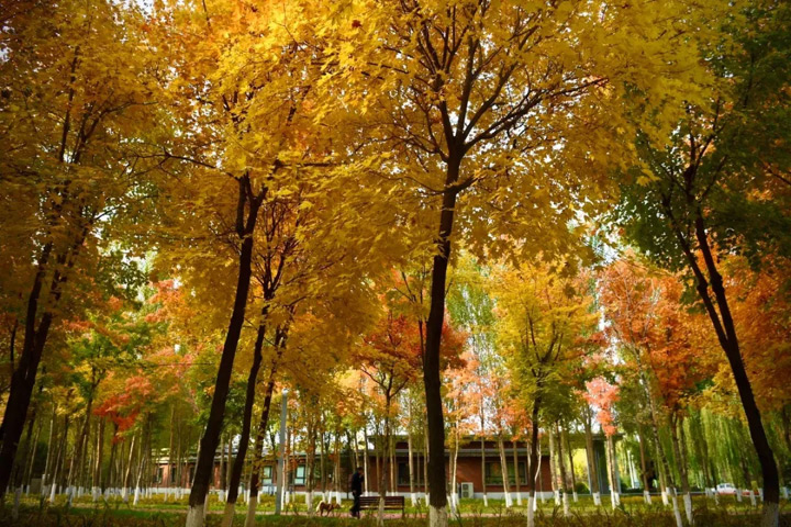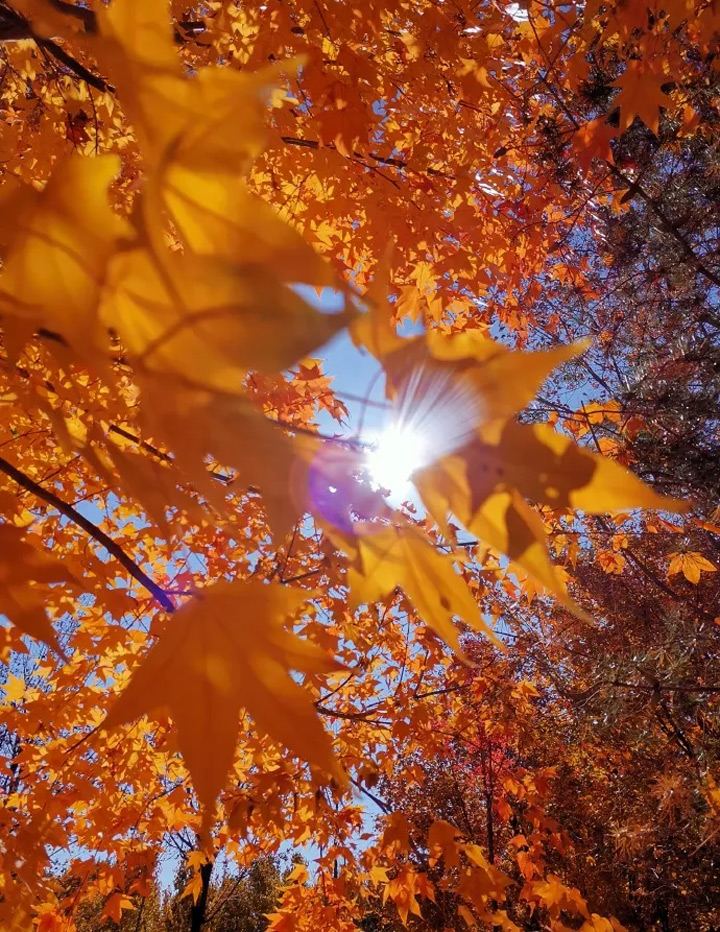 漫步在任意一條林蔭小道,兩側的樹木也是或金黃或紅火,枝葉層疊,迎著陽光,恣意淌入眼簾。