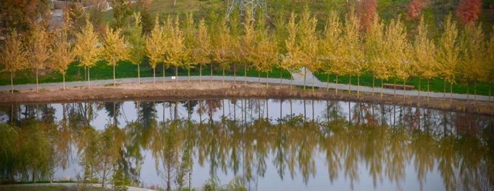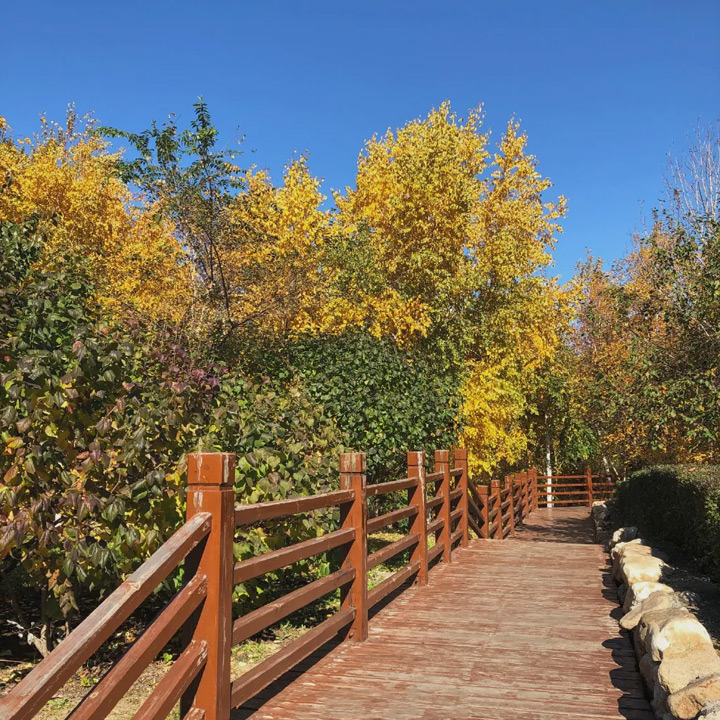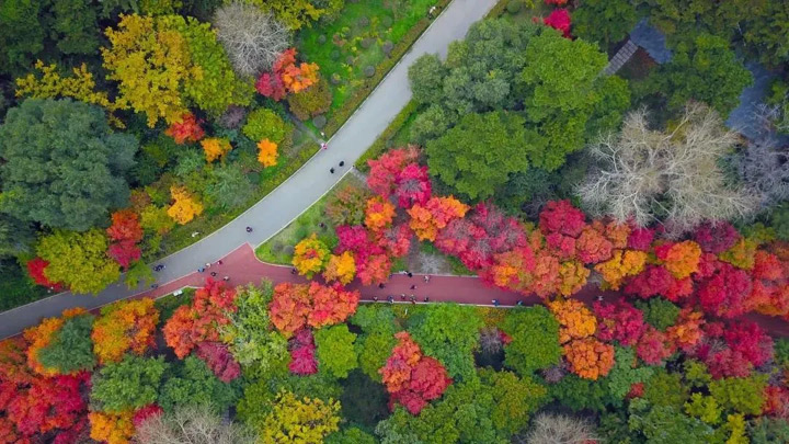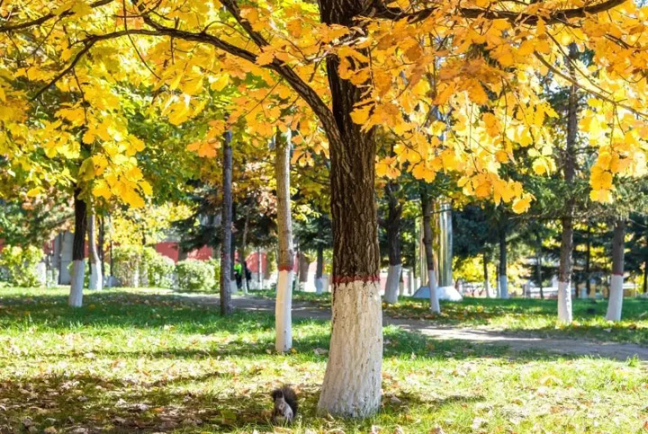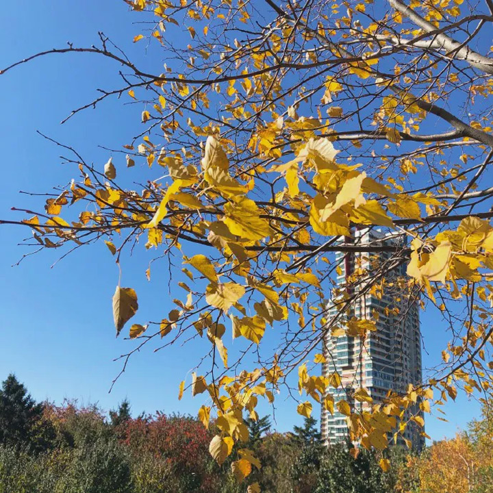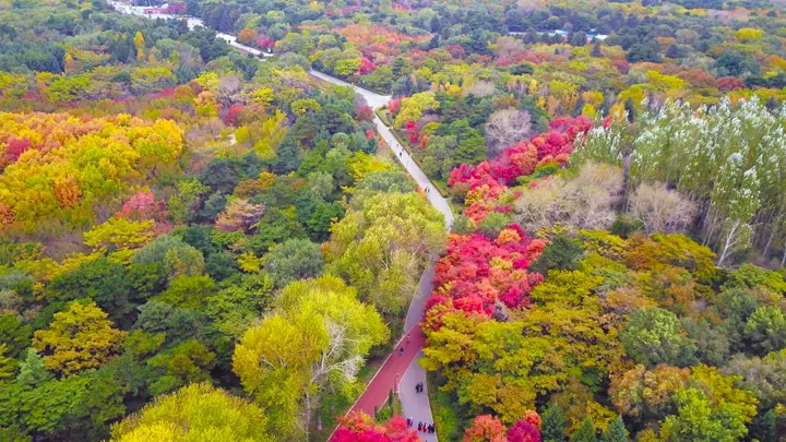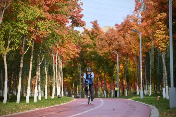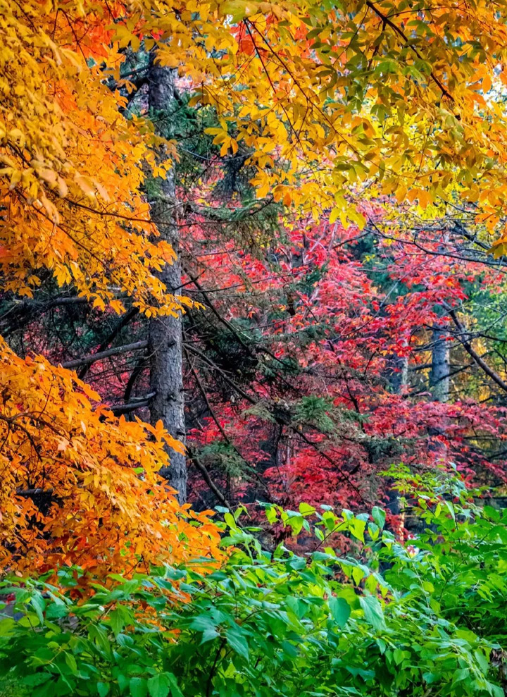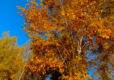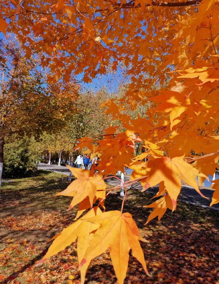 漫步在任意一條林蔭小道,兩側的樹木也是或金黃或紅火,枝葉層疊,迎著陽光,恣意淌入眼簾。