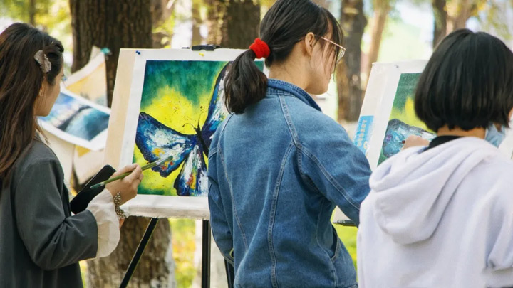 十月上旬的秋季,青黃相接,是美術生們寫生的好時節,樹林裡藏著最後一抹綠意,樹葉上逐漸染上‘秋日黃’,青黃雜糅,每一筆都是秋天的美麗。