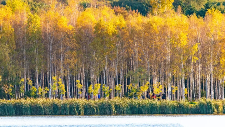 東嶺南街伊通河畔,河邊的樹林成為了一個漸變的調色盤,從綠色到黃色再到紅色,拼出了長春秋天的顏色。