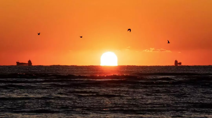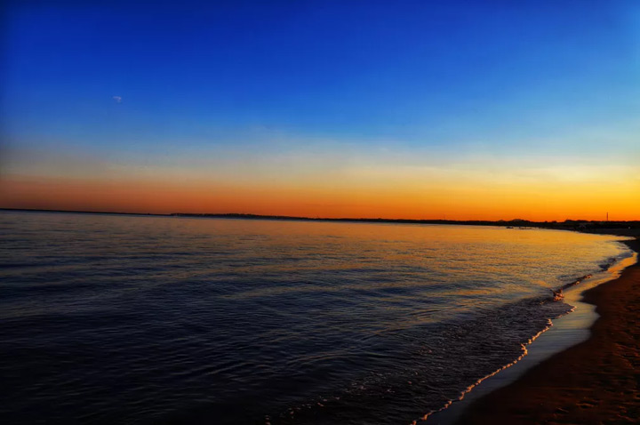 黃昏時刻,落日餘暉籠罩著海與天,