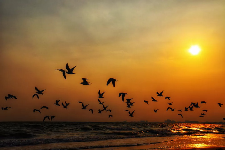 飛鳥盤桓在海面上自由的翱翔。