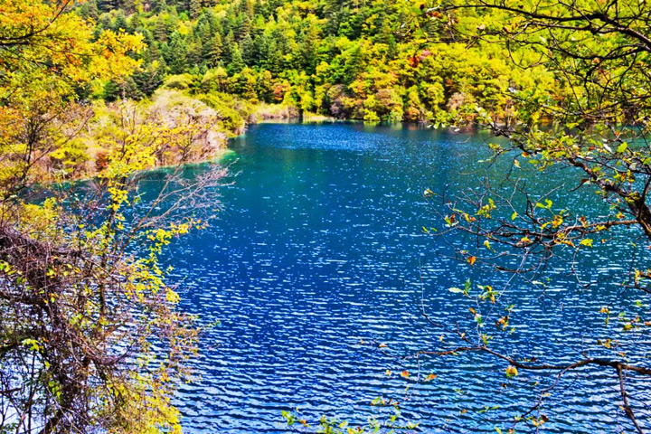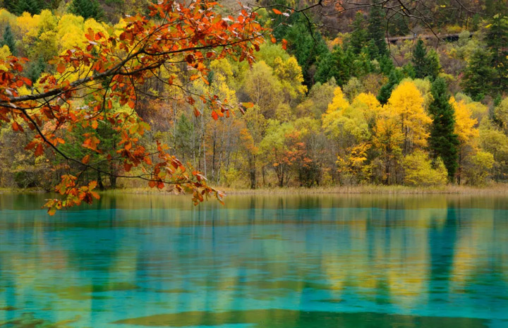 五花海位於九寨溝的日則溝中段,水面呈現出五顏六色。秋季,這裡是彩葉最集中的區域~ 溫馨提示:由於觀賞位置有限,人較多,一定要早去!