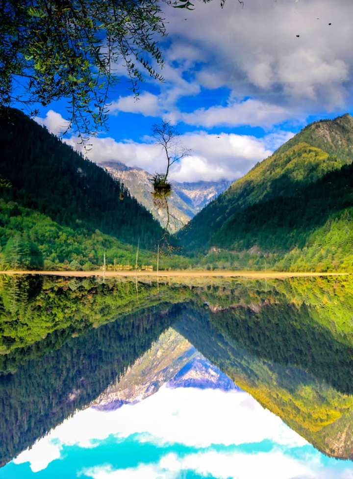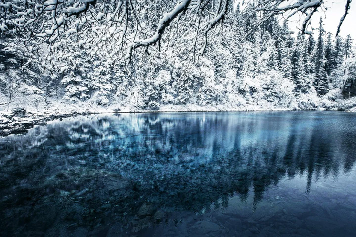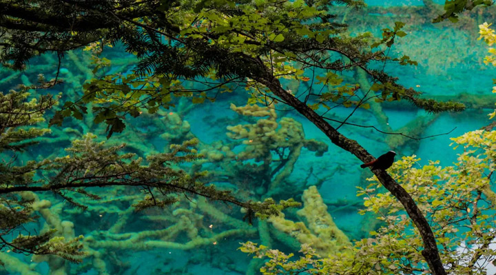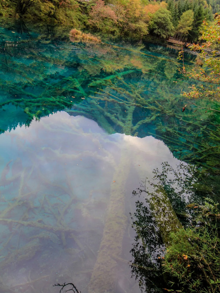 九寨的海子,清澈見底,水中的枯樹形態各異,靜靜沉在水底。它們在這裡也許已經沉睡了千年,用不朽的姿態,賦予了海子的鮮活。