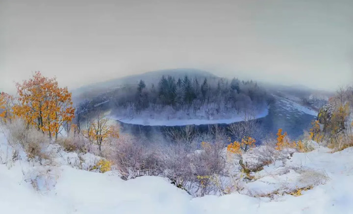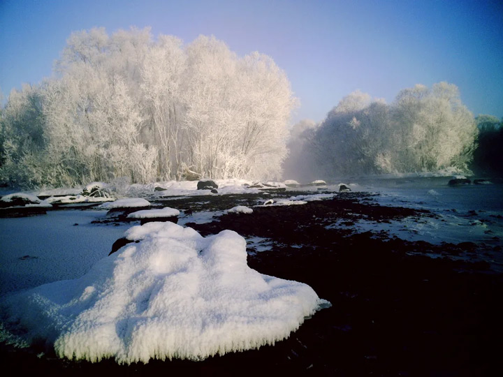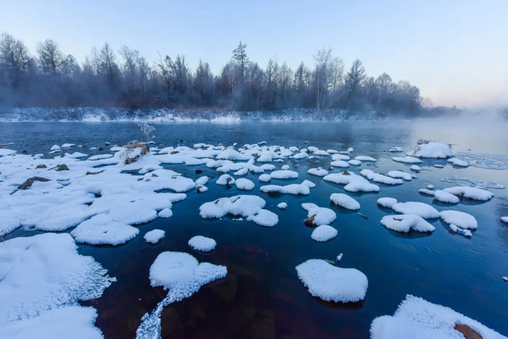 美麗的庫爾濱河驕傲的向前流淌,升騰的水霧在眼前飄蕩,縈繞在身邊,連同天地萬物一起綻放出純白的靈魂。