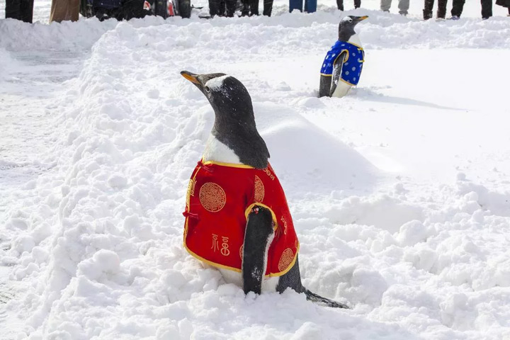 在視頻中,企鵝們穿上小唐裝在工作人員的保護下走到了戶外。小企鵝一出來便非常興奮,四處走來走去,欣賞美麗的雪景,還與馴養員玩雪互動,十分親昵。